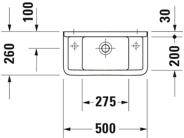 - rechteckige Beckenform mit 30mm breitem Rand und tiefer liegender Hahnlochbank rechts und links seitlich sowie Hahnloch-Vorstich für Einlocharmatur