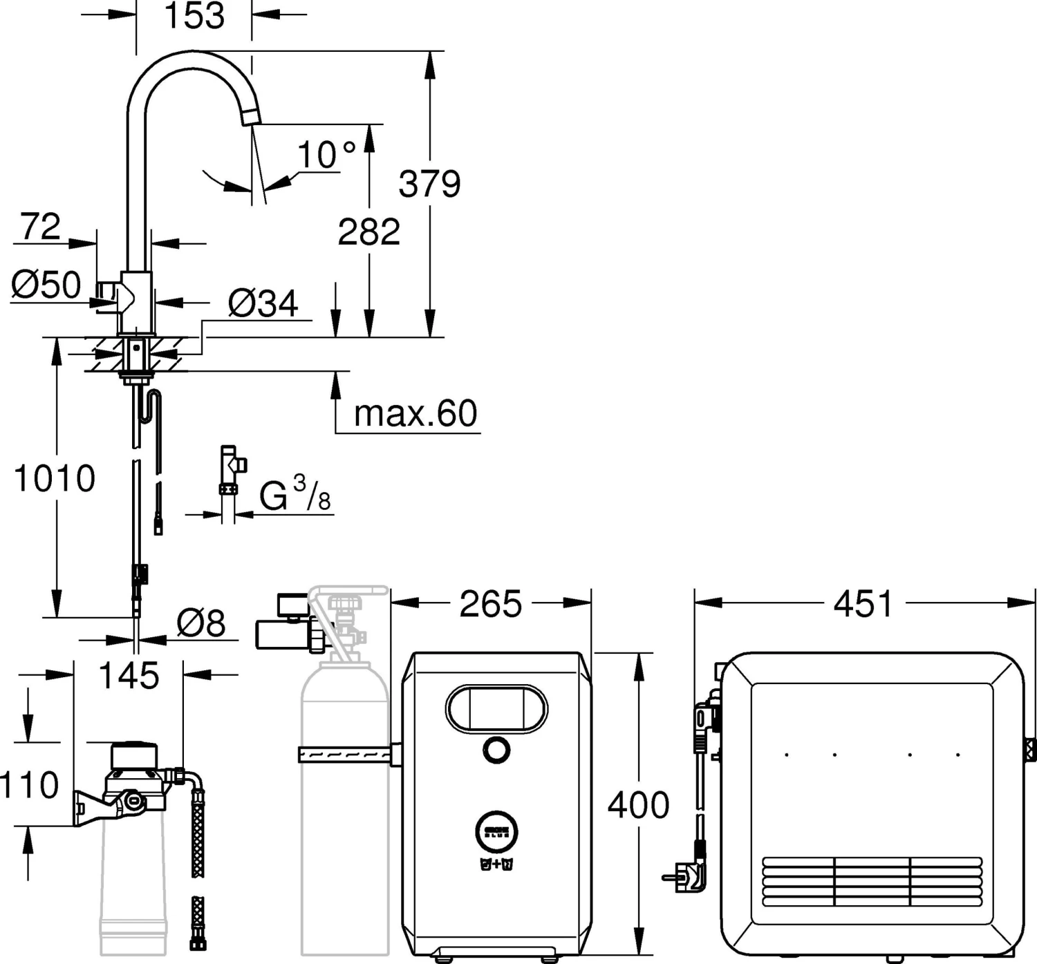 - Gefiltertes, gekühltes Trinkwasser in still, medium oder sprudelnd über Drucktasten-Griff