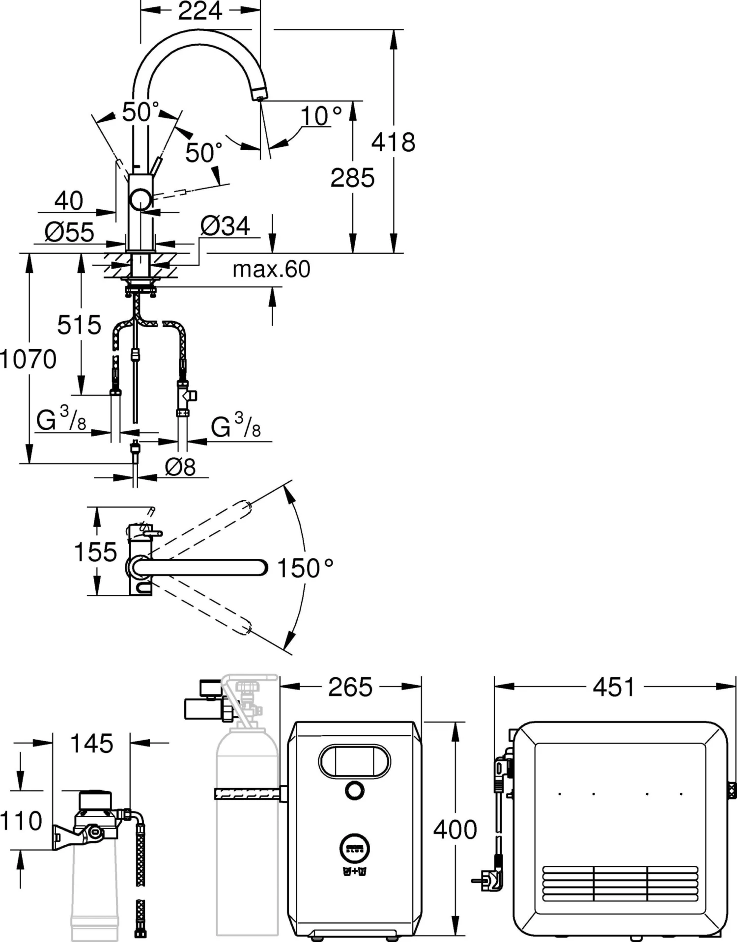 - Filter- bzw. CO2-Kapazität über GROHE Ondus App Push-Benachrichtigung bei niedriger Filter- bzw. CO2-Kapazität zusätzliche Überwachung über das GROHE Blue Professional Online-Dashboard möglich