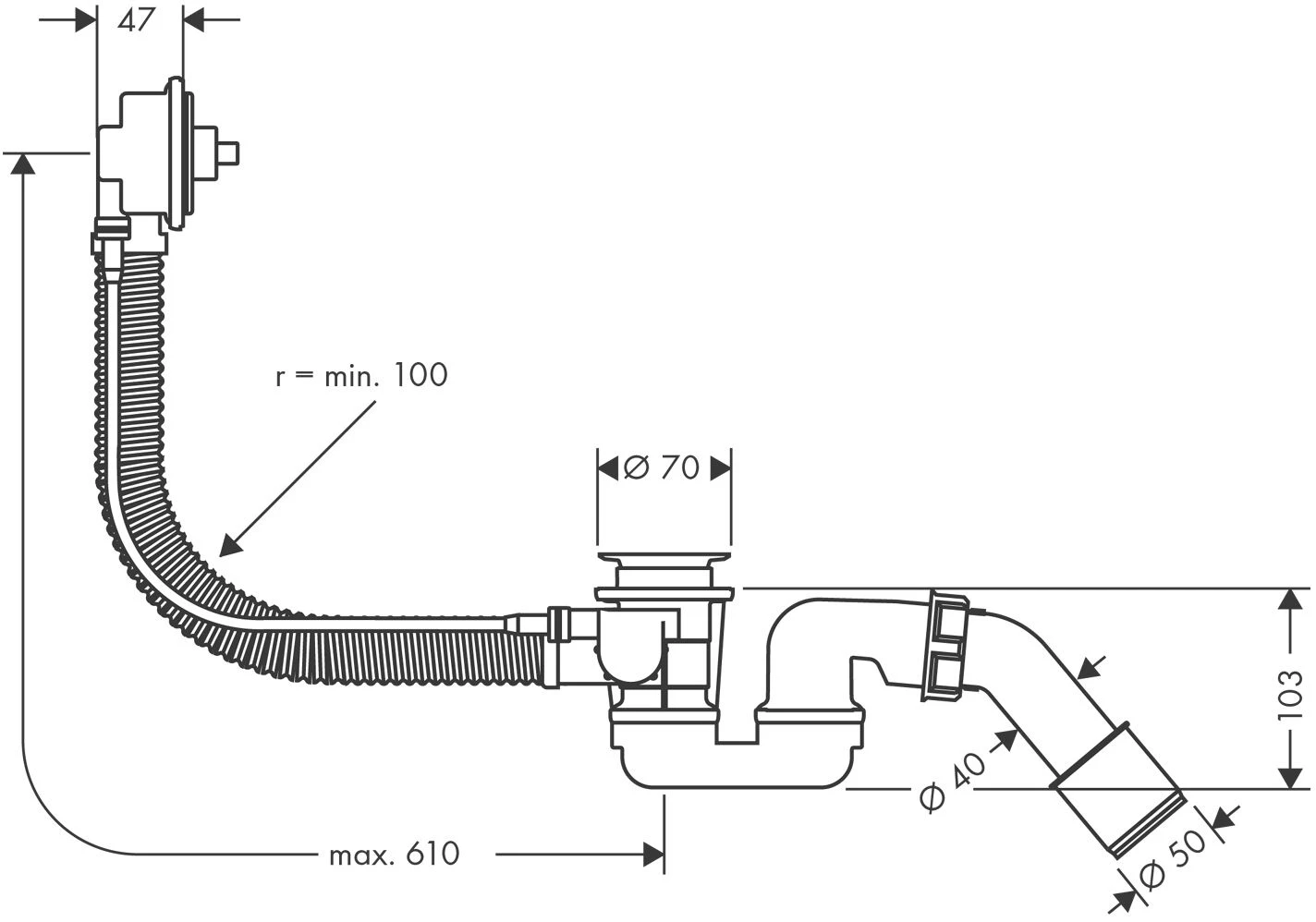 hansgrohe Wannenab-u.Überlaufgarnitur Flexaplus Grundset m.flex.Überlaufschlauch Grundkörper Flexaplus Wannenab- und Überlaufgarnitur 11/2″ für Normal- und Duschwannen, flexibler Überlaufschlauch, PE-Verschraubung 11/2″ x 40/50mm, Bowdenzuglänge 520mm, zu ergänzen mit Fertigset #58185xx0 oder #58186xx0″