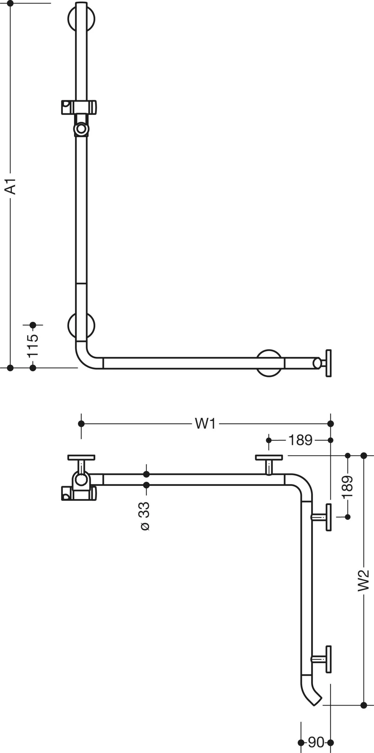 - mit zur Wand zeigendem 45° Endbogen an waagerechter Stange