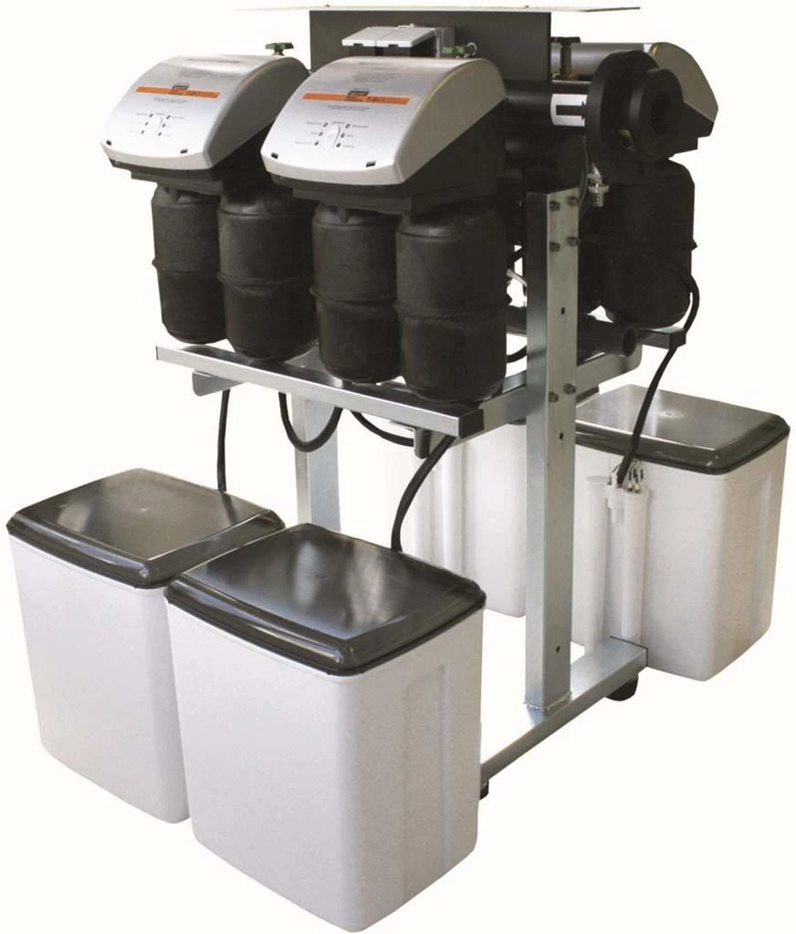 - bestehend aus einem Gestell mit angebautem Wasserverteiler (JCS 5 mit Anschlussblock JQT) und getrennt abstellbaren Enthärteanschlüssen zur Aufnahme der Einzelmodule (JCS 5 mit einem gemeinsamen Umgehungsventil)