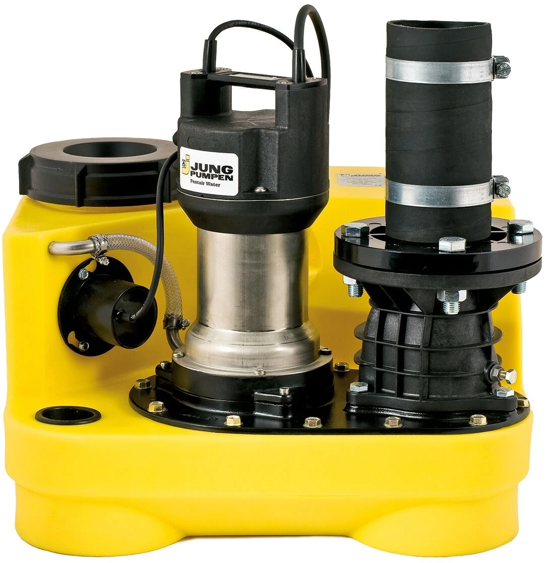 Die überflutbare Einzelanlage bestehtaus Kunststoffbehälter (PE) in Stufenform mit optimiertem Boden zur Reduzierung von Ablagerungen und Verstopfungen, Trägerplatte aus Grauguss mit integriertem Ringgehäuse, aufgesetzter Motor, Rückschlagklappe und Druckabgang.