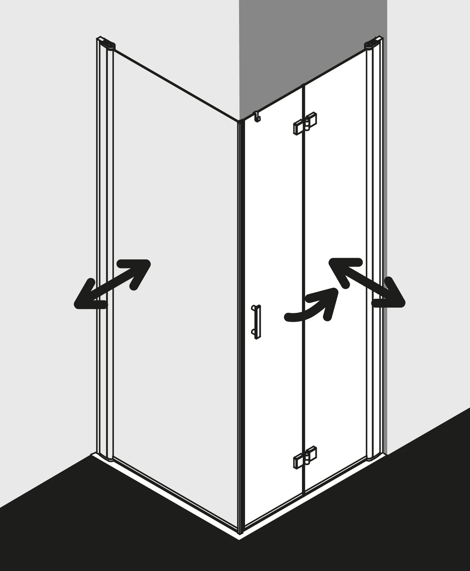 - mit zwei Glasflügeln – im Wandgelenkprofil 90° nach innen und außen schwenkbar