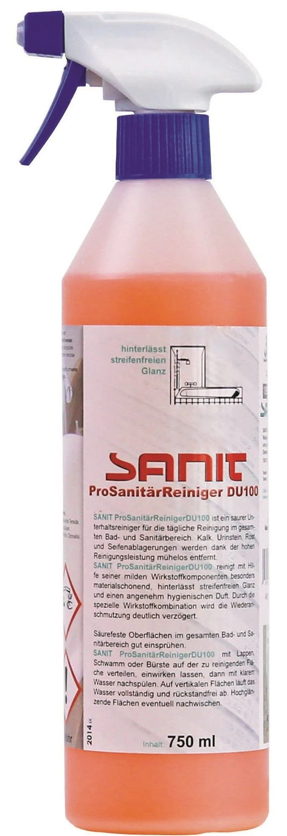 Sanit ProSanitär Reiniger DU100 3025, 750 ml, Flasche mit Sprüher. Sanit ProSanitärReinigerDU100 ist ein saurer Unterhaltsreiniger für die tägliche Reinigung im gesamten Bad- und Sanitärbereich. Kalk, Urinstein, Rost und Seifenablagerungen werden dank der hohen Reinigungsleistung mühelos entfernt. SANIT ProSanitärReinigerDU100 reinigt mit Hilfe seiner milden Wirkstoffkomponenten besonders materialschonend, hinterlässt streifenfreien Glanz und einen angenehm hygienischen Duft. Durch die spezielle Wirkstoffkombination wird die Wiederanschmutzung deutlich verzögert.