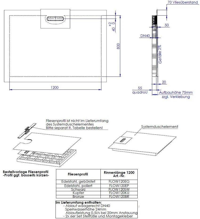 - Gefälleelement mit werkseitig eingearbeitetem Gefälle von ca. 2 %