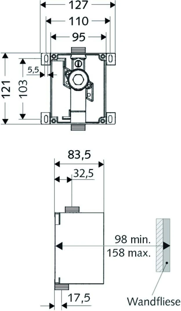 Schell Urinal Wandeinbau Spülarmatur Compact II 1/2″ Rohbauset für mechanische und elektronische Auslösung Geräuscharme Wandeinbau-Spülarmatur mit innenliegender Vorabsperrung zur Aufnahme der Schell Urinalbetätigungen oder Urinalsteuerungen. Spülarmatur konform DIN EN 12541 Lieferumfang: Kunststoff-Rohbaugehäuse mit Putzdeckel Vormontierte Wasserstrecke mit Vorabsperrung Dichtstopfen Putzdeckel Einsatzbereich / technische Daten: Fließdruck: 0,8 . 5 bar Spülstrom: 0,3 l/s Armaturenanschluss G 1/2″ (DN 15) AG Werkstoff: Wasserstrecke aus Messing DIN EN Geräuschklasse: I Prüfzeichen: PA-IX 18779/I DVGW mit Fertigbauset 028000699, 028001599 und 028012899 – bitte separat bestellen – nicht im Lieferumfang enthalten