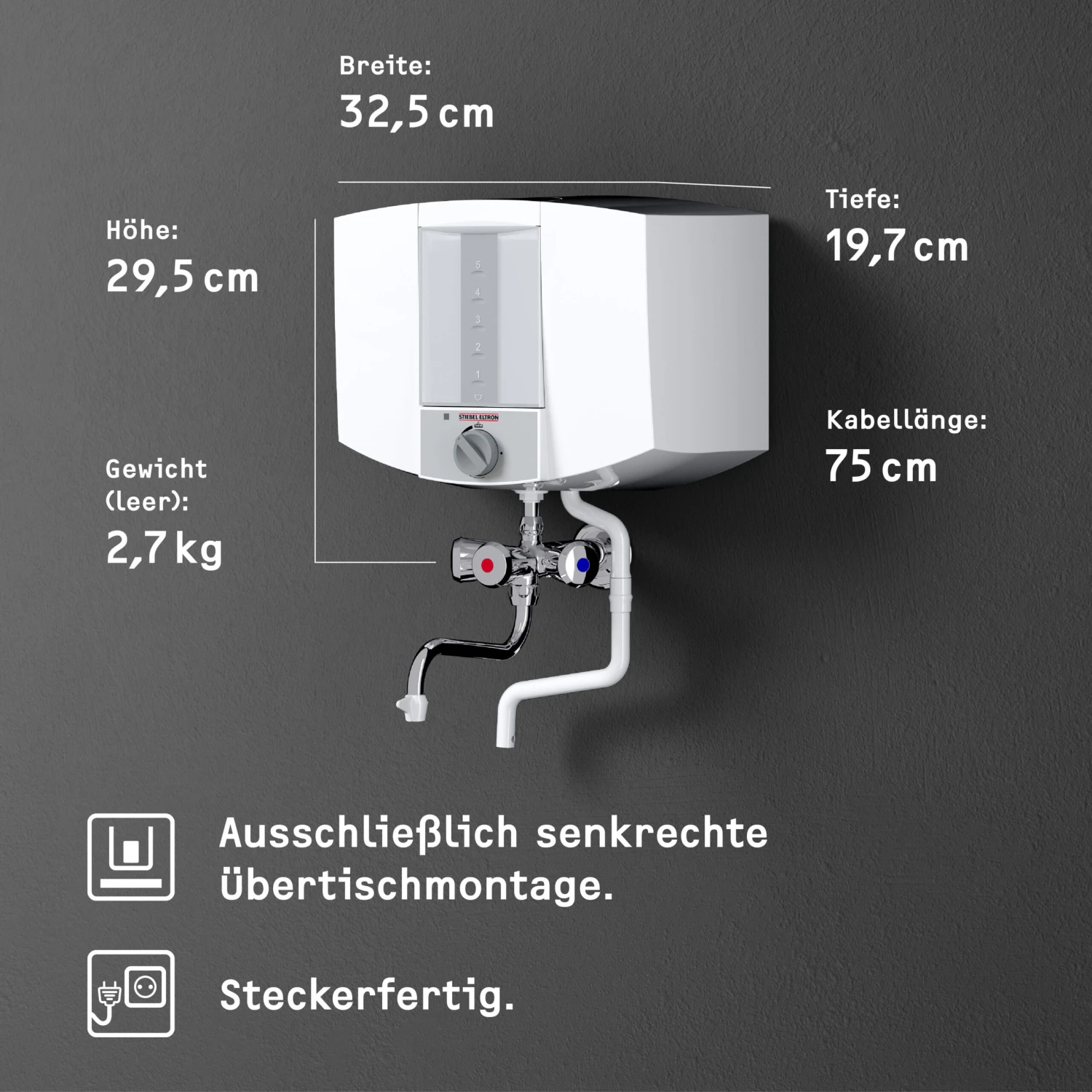 - LIEFERUMFANG: STIEBEL ELTRON Boiler KBA 5 KA, Füll- / Ablaufarmatur, Bedienungs- und Installationsanleitung, Wandaufhängung, Montageschablone, jeweils 2 Schrauben, Dübel, Scheiben