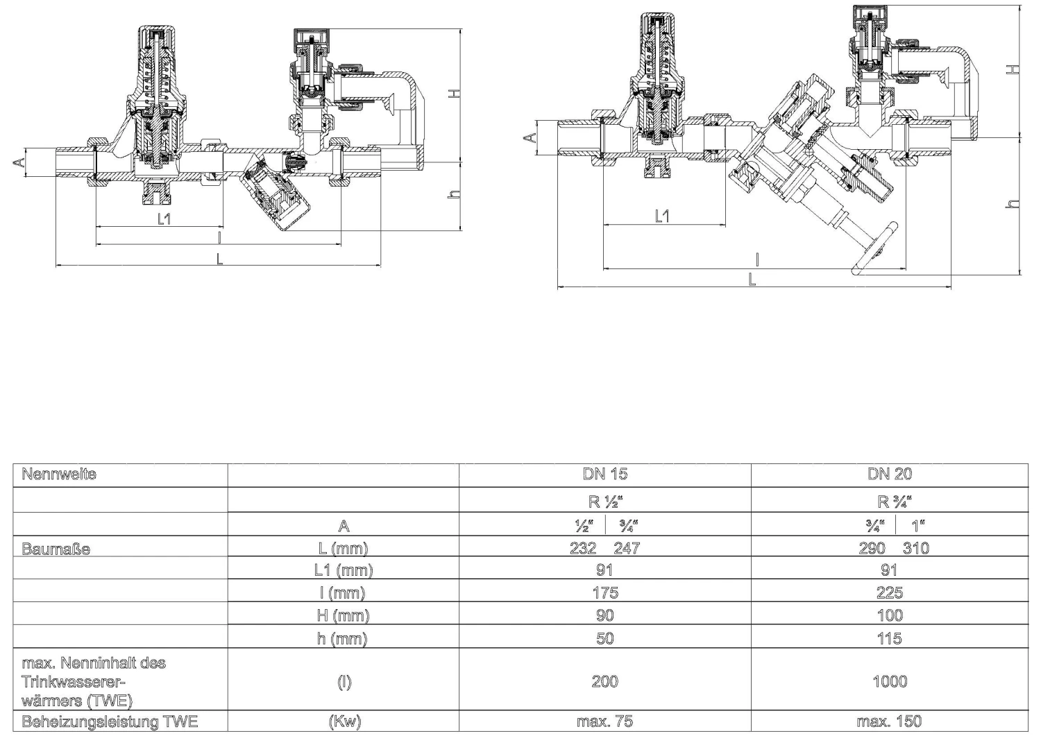 Syr Sicherheitsgruppe 25 SYRobloc DN 20, G3/4 6bar rohgelb SYRobloc-Sicherheitsgruppe 25, für den Anschluss von geschlossenen Trinkwassererwärmern nach DIN 1988. Bestehend aus: Absperrventil, Rückfluss- verhinderer mit Prüfeinrichtung, zweitem Absperrventil (nur DN 20), Membran- Sicherheitsventil, neuem, verlängerbarem Ablauftrichter und mit Druckminderer, Ausgangsdruck regelbar von 1,5 bis 6 bar. Werkseitig voreingestellt auf 4 bar Gehäuse aus Pressmessing, Kappe des Sicherheitsventils aus glasfaserver- stärktem Kunststoff. Sitz des Sicher- ventils aus Edelstahl. DN 20, 6 bar, Verschraubung G 3/4, rg. Bauteilprüfungen: DIN-DVGW geprüft, TÜV-SV-10-545, Schallschutzprüfnummer PA-IX 1794/I.